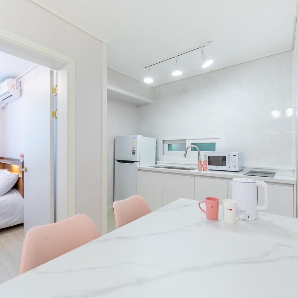 * 취사도구 : 냉장고, 싱크대, 전자레인지, 커피포트, 빌트인 레인지, 식기, 냄비세트, 조리도구